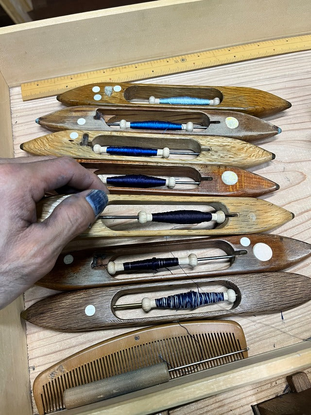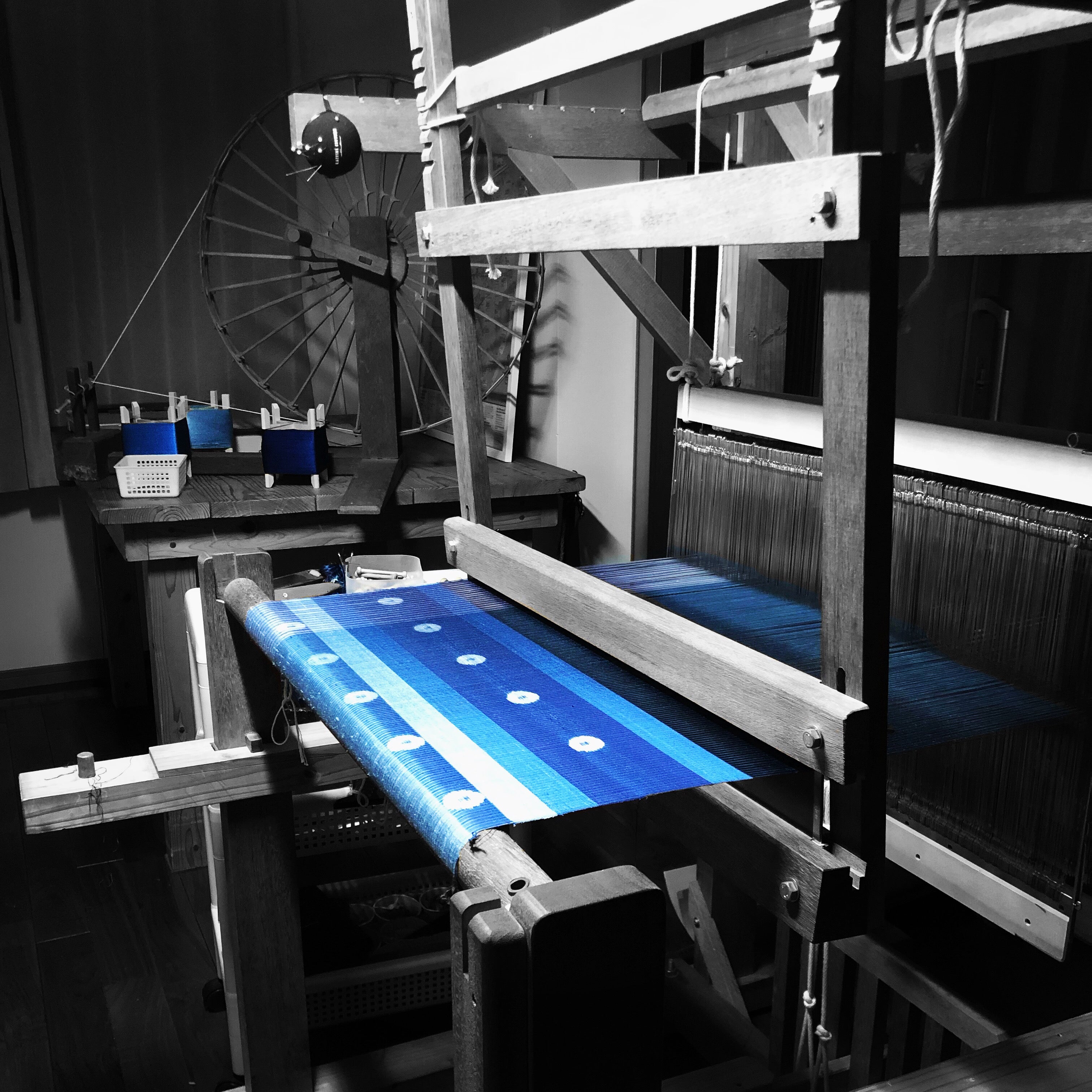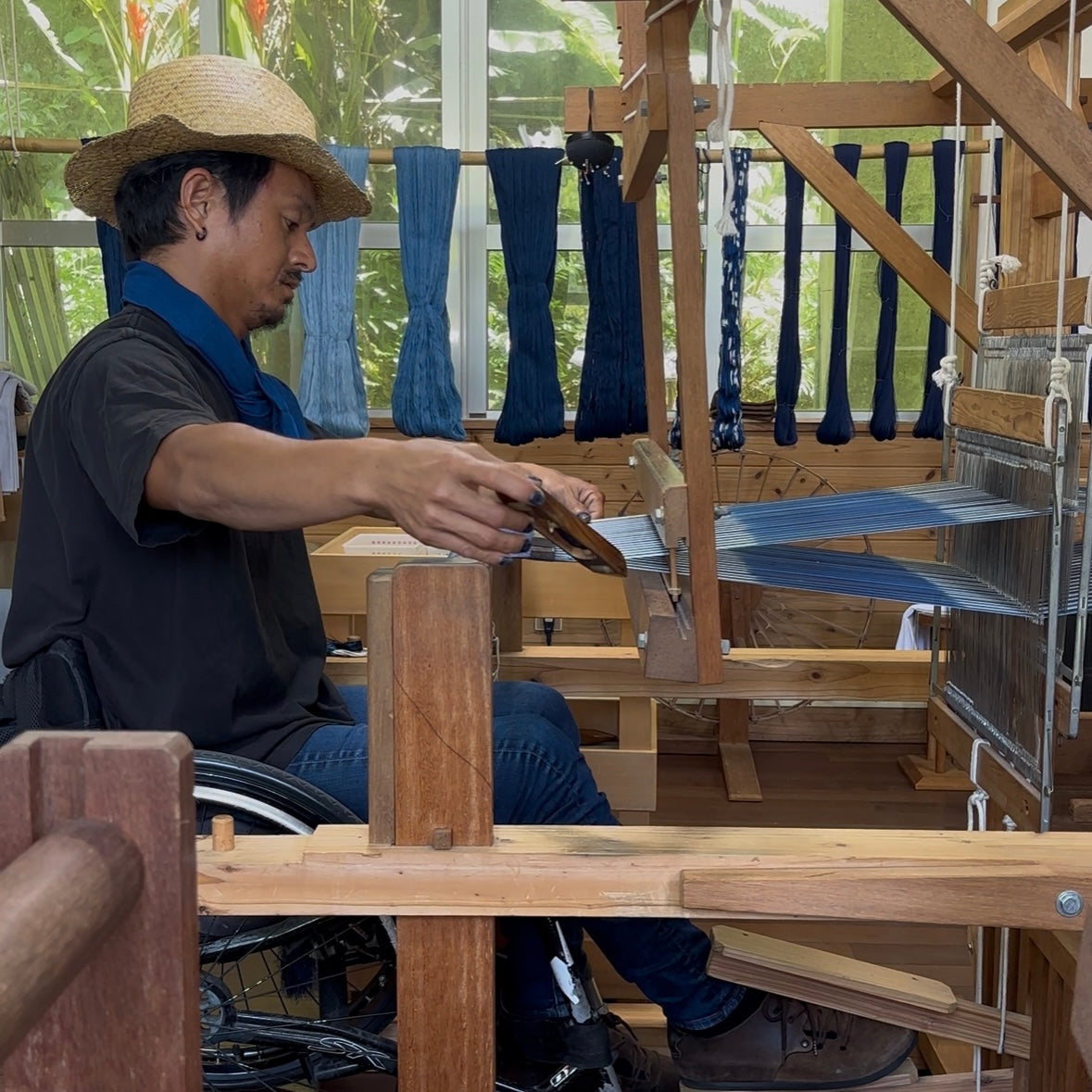 シャートントン、シャートントン 工房に響く機織りの音は、まるで寄せては返す波の音のようです。経糸(たていと)が開いた糸道に緯糸(よこいと)を通し、筬(おさ)を打ち込む。その一瞬一瞬に、私は青い海と空が広がるこの地に流れる、時間を織り込んでいます。 「オキナワブルース」に込めた意味 「オキナワブルース」。 この言葉には、私が生まれ育った「沖縄」への敬意と、二つの大切な意味が込められています。 一つは、「色彩としての青」。 この島の美しい海と空の色と、それらを色見本に染め重ねることで変化していく琉球藍の濃淡(グラデーション)。 そしてもう一つは、「歴史が奏でる想い(ブルース)」。 喜びも悲しみも、すべてを紡いで歌い継ぐ音楽のように、この青い糸には、700年という長い時の中で先人たちが繋いできた、数え切れないほどの物語が染め重ねられています。 700年前、海を越えた青 時計の針を、はるか昔に戻しましょう。 今からおよそ700年前、沖縄は「琉球王国」という小さな島国でした。琉球は、平和を愛し、「万国津梁(ばんこくしんりょう)」、世界の架け橋となり、人と人、国と国とが繋がる貿易の中継地点として繁栄しました。 中国や東南アジアの国々と活発に行き来した、大交易時代。 荒波を越えた先人たちが持ち帰った品々の中に、藍の苗と、高度な染織の技術がありました。 この深く鮮やかな青は、平和を願い、世界と繋がろうとした「万国津梁」の精神が、海を越えて運んできた色なのです。 焦土から芽吹いた、先人の「想い」 しかし、琉球の歴史は光り輝く時代ばかりではありません。 特に、沖縄戦(第二次世界大戦)において、 美しい首里の都も、豊かな森も、多くの尊い命と共に焦土と化しました。 伝統的な道具も、貴重な資料も、壊滅的な被害を受けました。 それでも先人たちは、「この文化を絶やしてはならない」と、アメリカ軍のゴミ捨て場から持ってきた麻袋や毛糸の靴下を解いて糸にし、カーボン紙やマラリアの薬、婦人の紅などを染料とし、戦後の焼け野原から、再び美しい布を織り上げたのです。私が継承したいのは、単なる「物」ではなく「生き様=ブルース」。挑戦は続きます。 現代の「万国津梁」として オキナワブルース商店は、この素晴らしい沖縄の文化を受け継ぎ、世界と次世代へ繋ぎます。かつて琉球の船が世界を結んだように、琉球王国時代から受け継がれる先人の知恵と技術をあなたの「styce」(style&stanceを掛け合わせた造語です。)へ。沖縄の自然と歴史が織りなす「青」をお届けします。 This world is connected in BLUES....