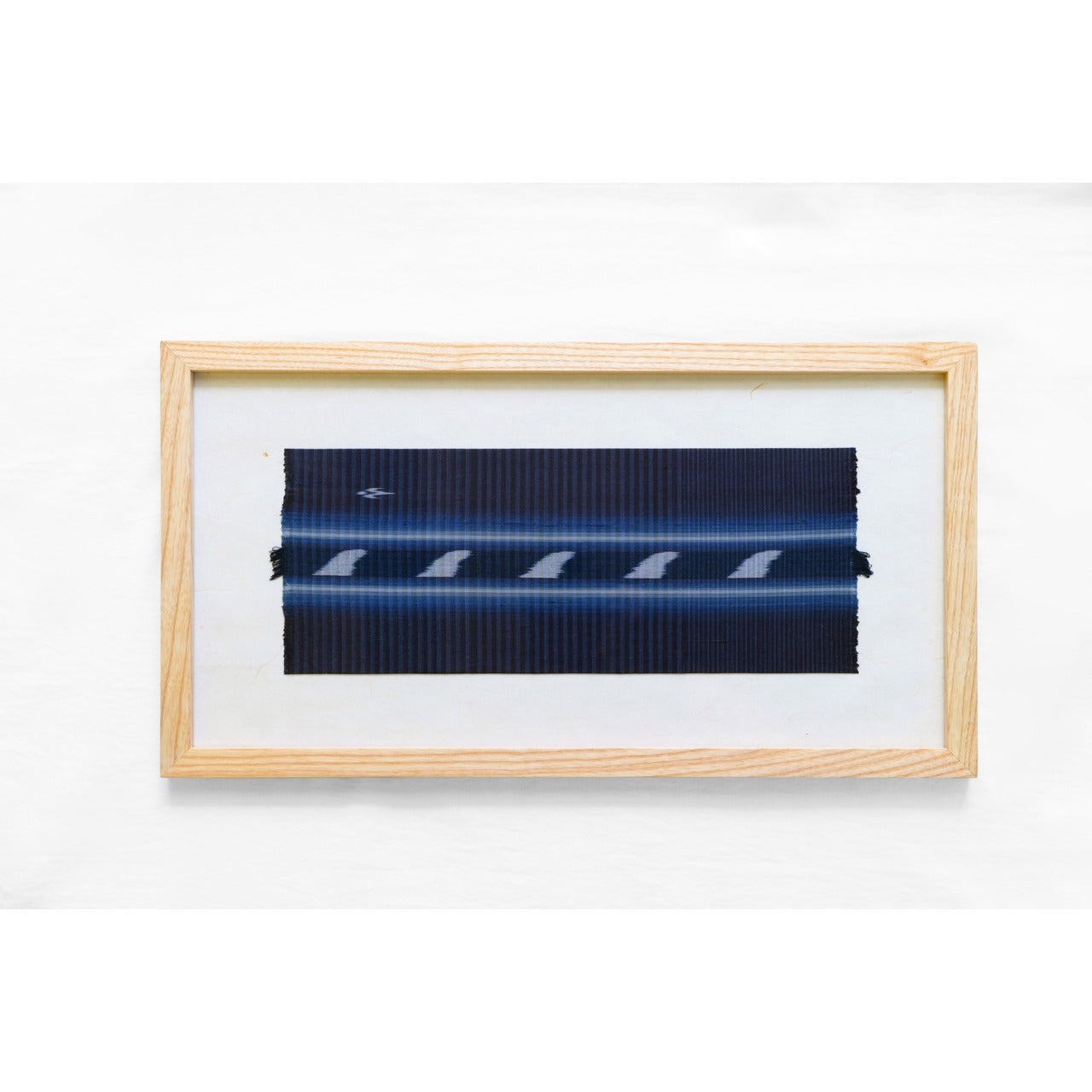 サーフィンの道具であるフィンを波に模し創作した絣と、沖縄の伝統文様トゥイグヮー(鳥)を組み合わせ「飛躍」、ハンティントンに打ち寄せる波に立ち向かう様を表現しました。